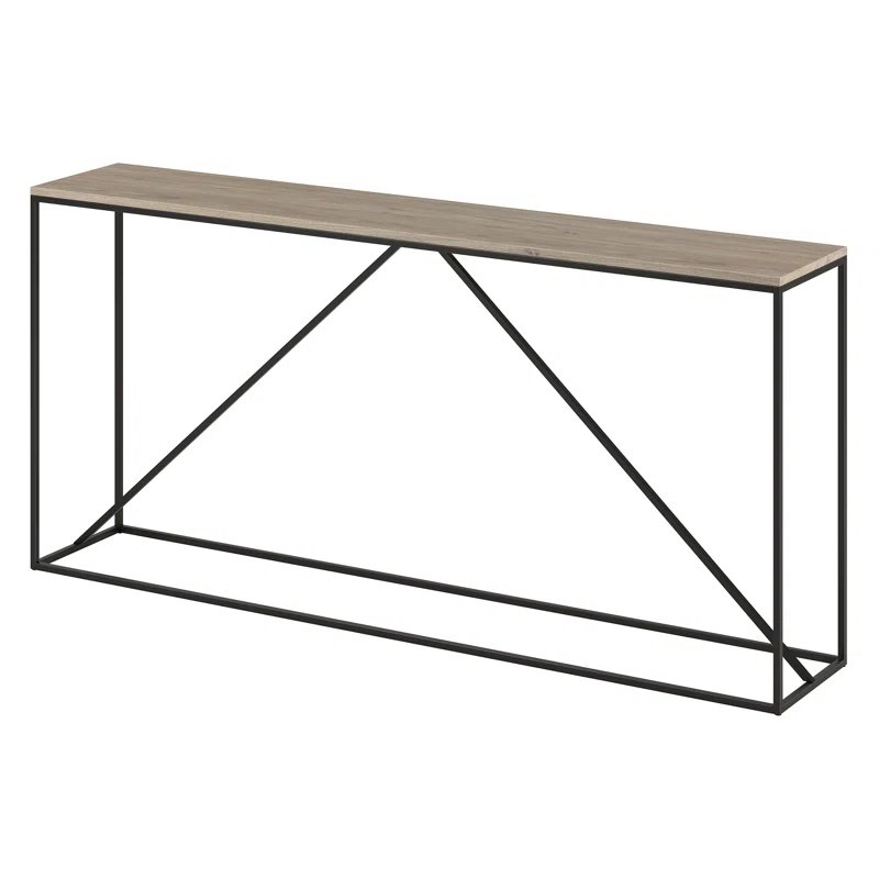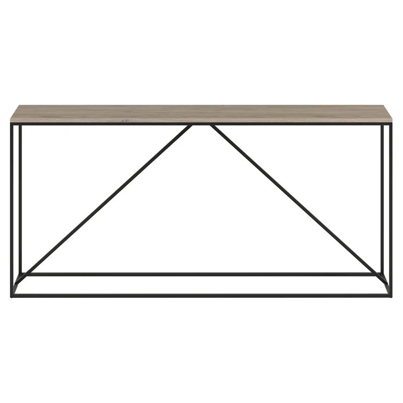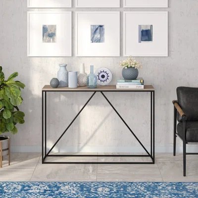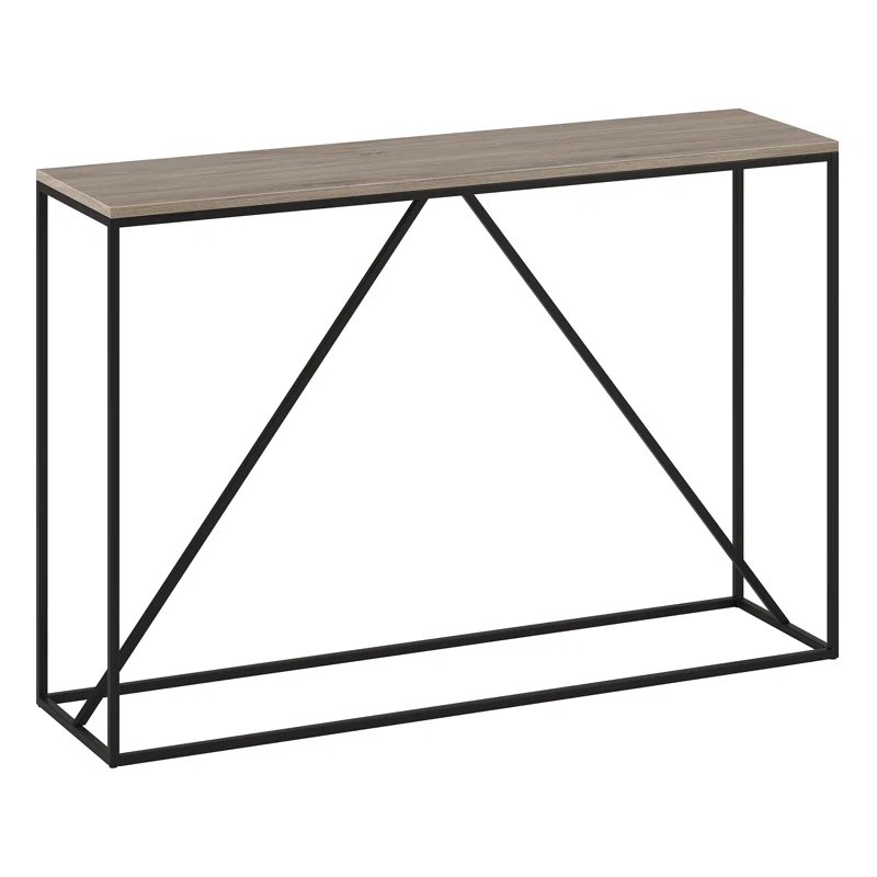 This console table is built for utility and design, featuring an on-trend wood-look top with a 40 lb. weight capacity. Its thoroughly modern blackened bronze frame features diagonal center support that adds stability and visual interest. Its narrow profile makes this a perfect choice for compact spaces where you need that extra bit of storage.